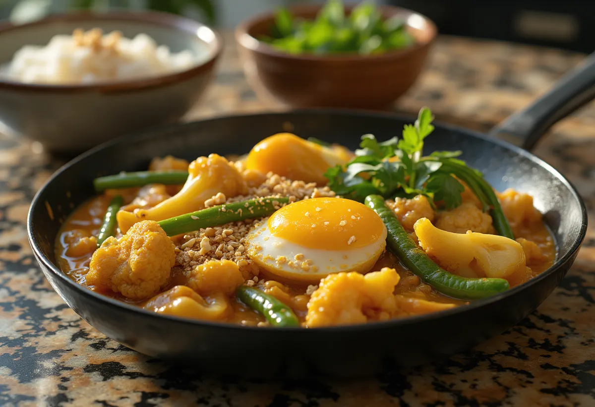 Загрейте кокосовото масло в уока. Добавете къри пастата и запържете за половин минута.