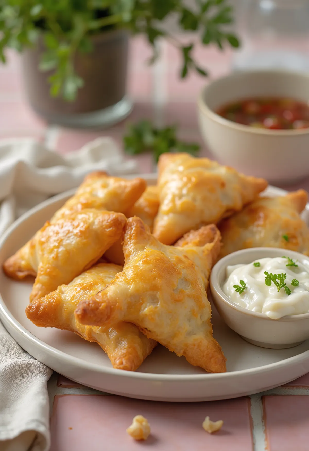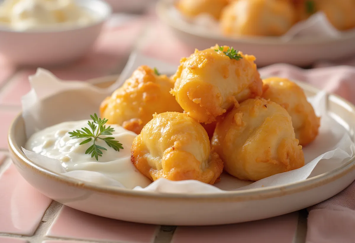 Сервирайте горещите, хрупкави кошини със студения, ароматен чеснов дип.